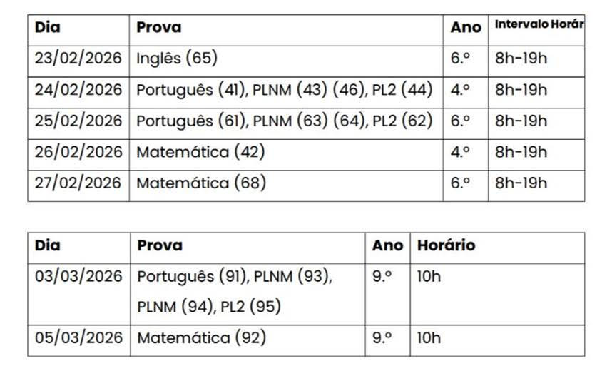 As provas-ensaio serão realizadas nas disciplinas/ literacias a que se aplicarão provas ModA ou PFEB, nomeadamente, Português (4.º, 6.º e 9.º anos), Matemática (4.º, 6.º, 9.º anos) e Inglês (6.º ano) de acordo com a seguinte calendarização: